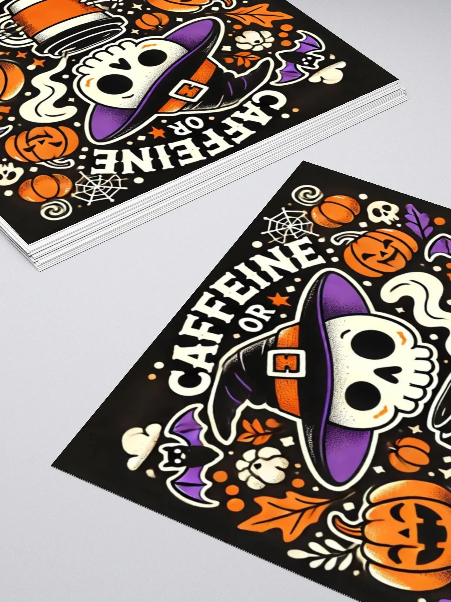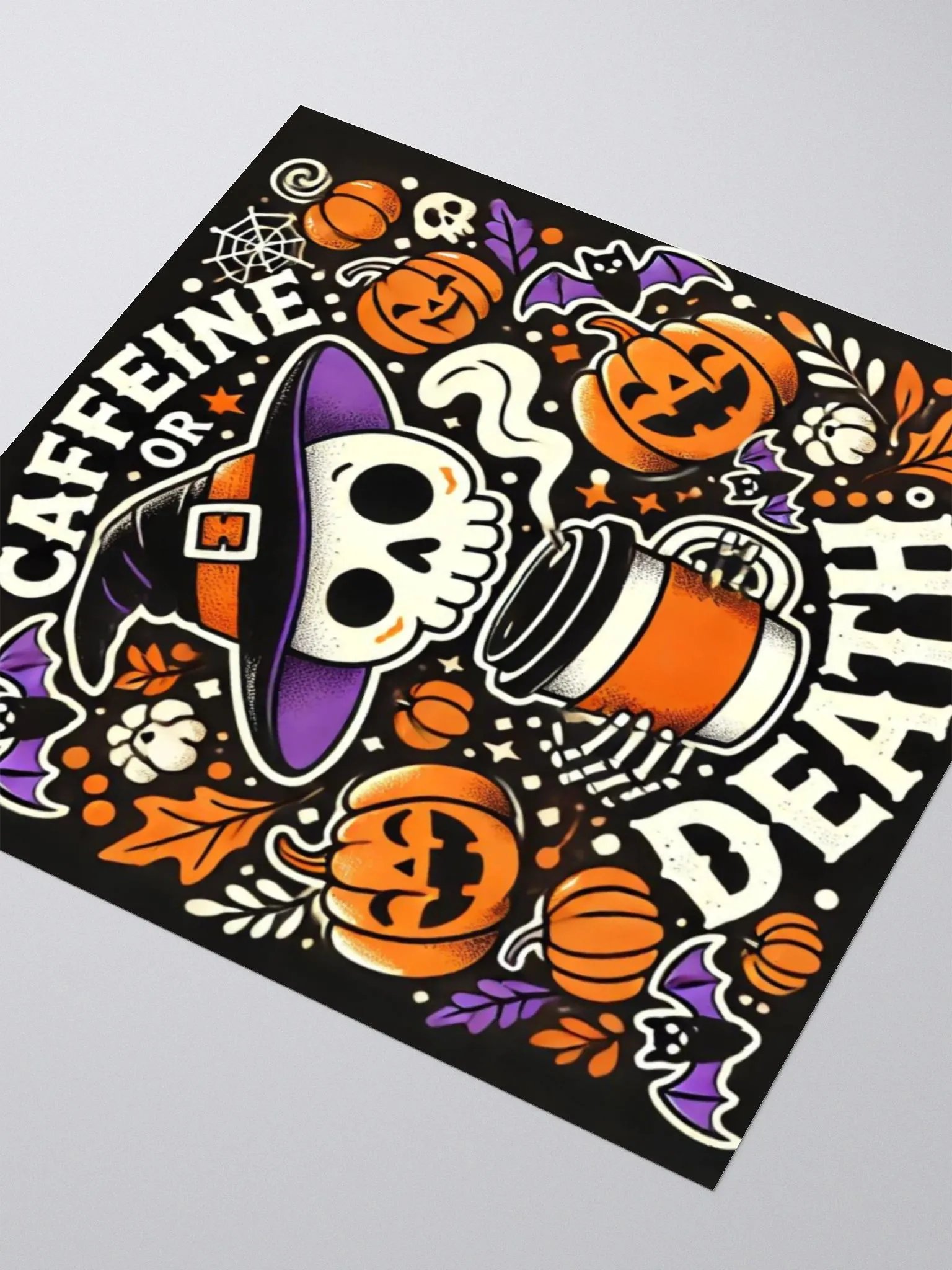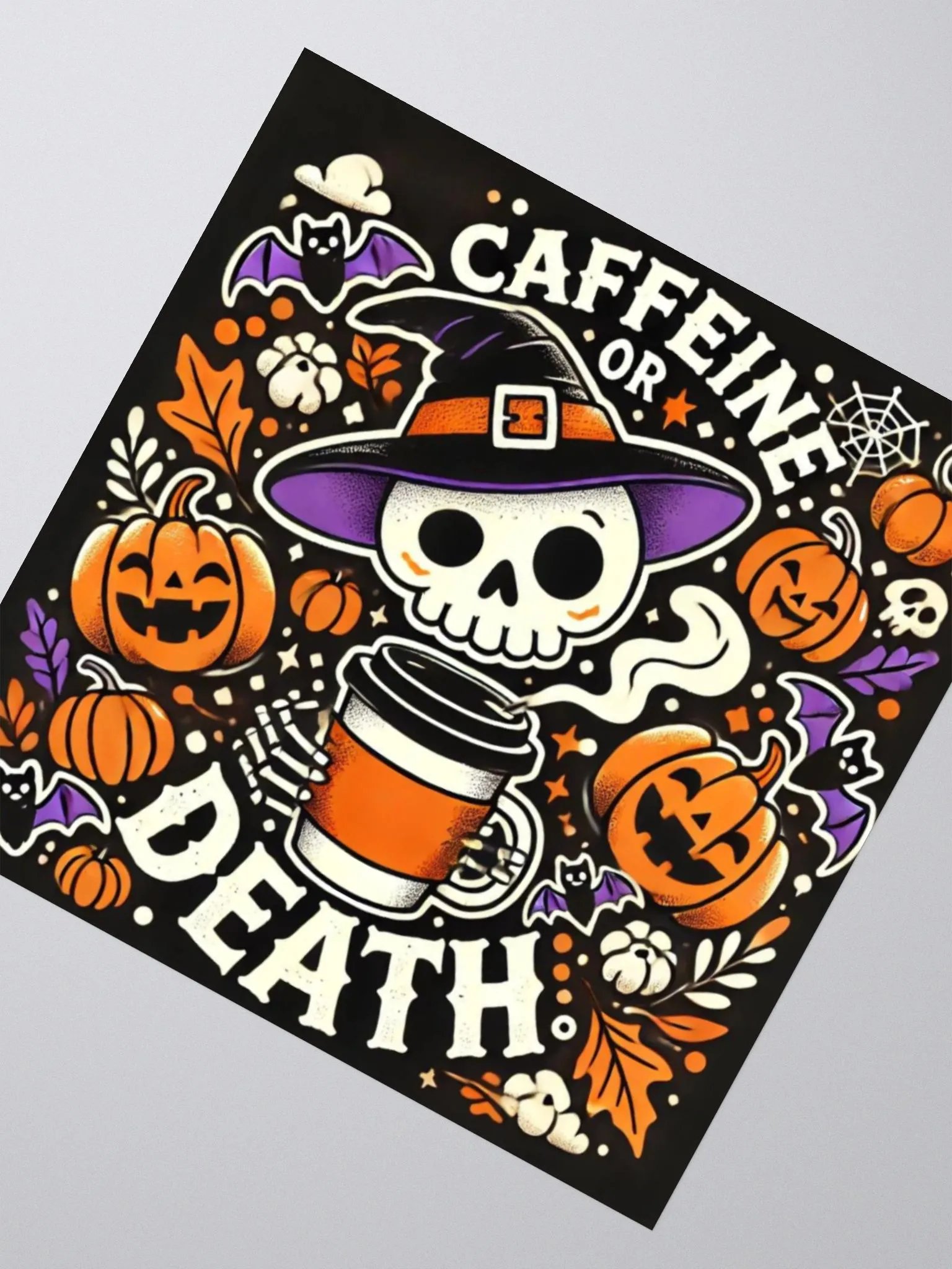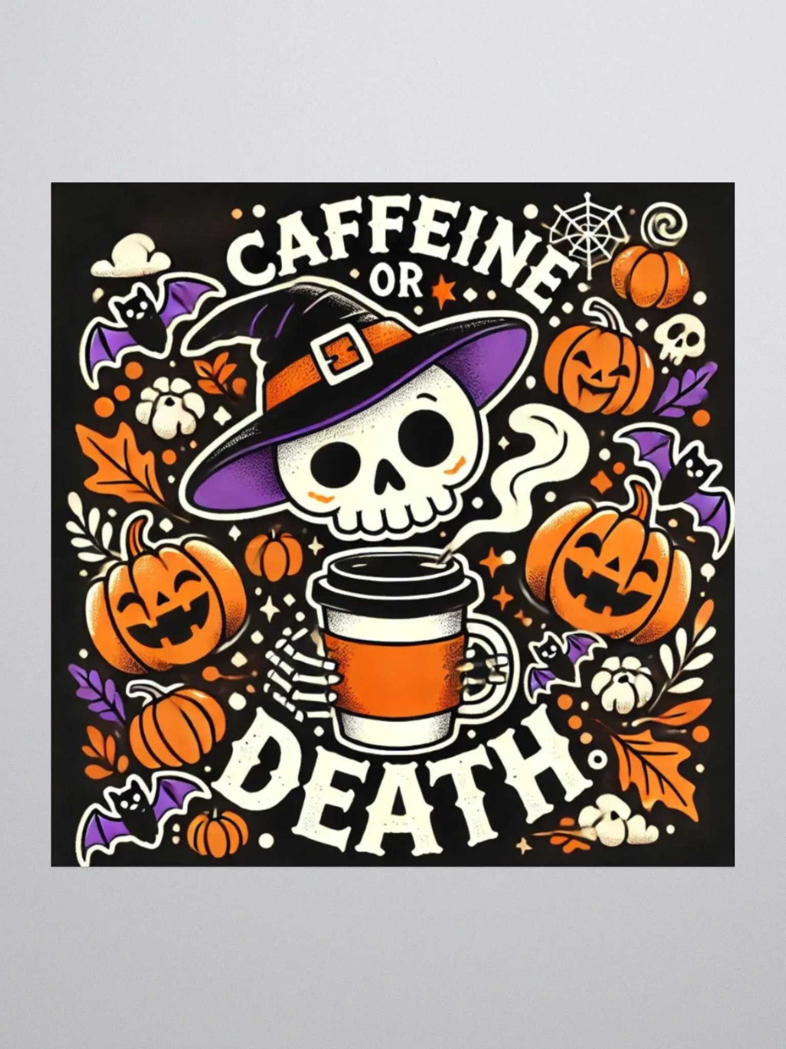 Add a spooky twist to your caffeine addiction with this vibrant "Caffeine or Death" sticker. Featuring a cute yet eerie skeleton rocking a witch's hat and holding a hot cup of coffee, this design is surrounded by festive Halloween elements like pumpkins, bats, and cobwebs. Perfect for coffee lovers and Halloween enthusiasts, this sticker is sure to give your water bottle, laptop, or journal a seasonal flair. Durable and waterproof, it’s built to last through your busiest (and most caffeinated) days!