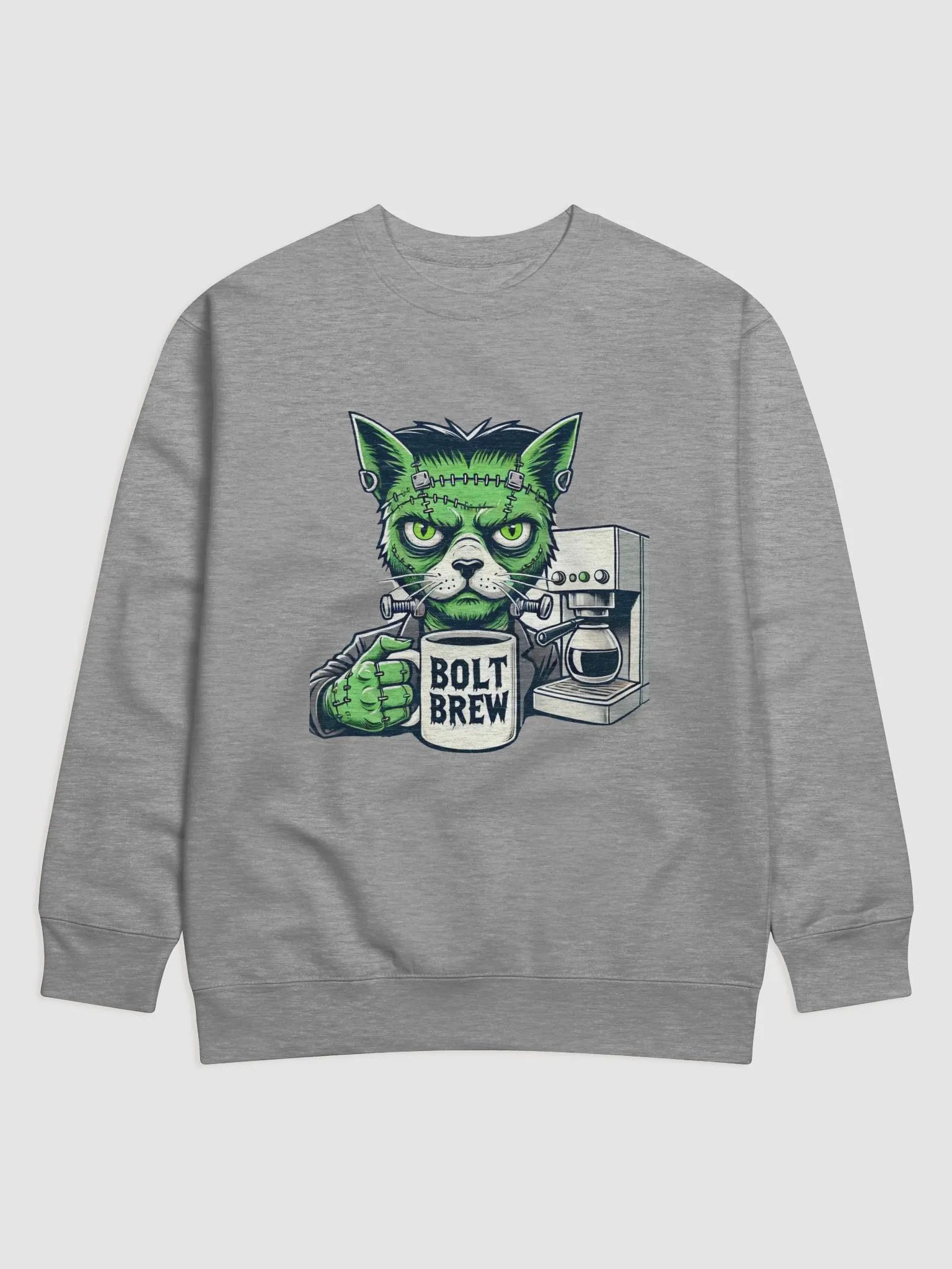 Unleash your inner mad scientist with our "Franken-Cat Bolt Brew" sweatshirt! Featuring a fearsome, caffeine-fueled feline brought to life with bolts, stitches, and a brewing coffee obsession, this design is perfect for those who love their coffee strong and their style spooky. The Frankenstein-inspired cat, clutching a bold "Bolt Brew" mug, adds an electrifying touch to your casual wardrobe.